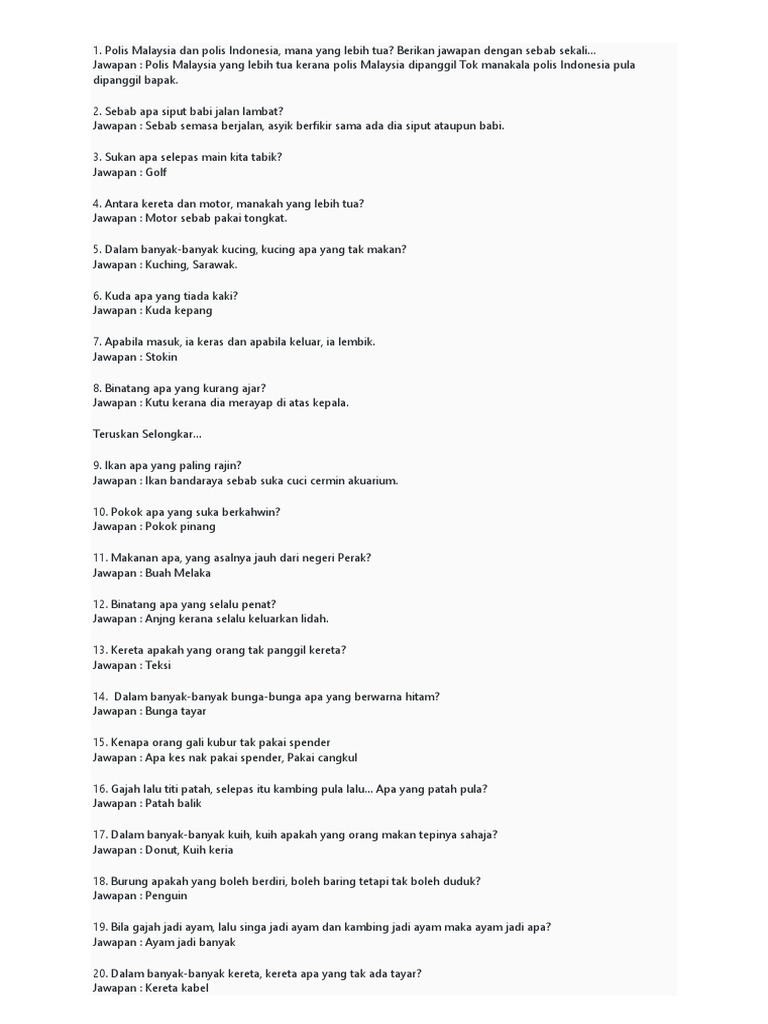 Pada kali ini kami ingin nyatakan bahawa sidang admin telah kongsikan satu post yang sangat bagus untuk murid-murid cetak iaitu Pelbagai Contoh Teka Teki Makanan Malaysia Jawapan Yang Bernilai. Jawapan Anda Terkunci Di Dalam Kereta Anda terkunci di dalam sebuah kereta dan ada satu penukul di tangan anda. Jawapan Teka Teki 1.